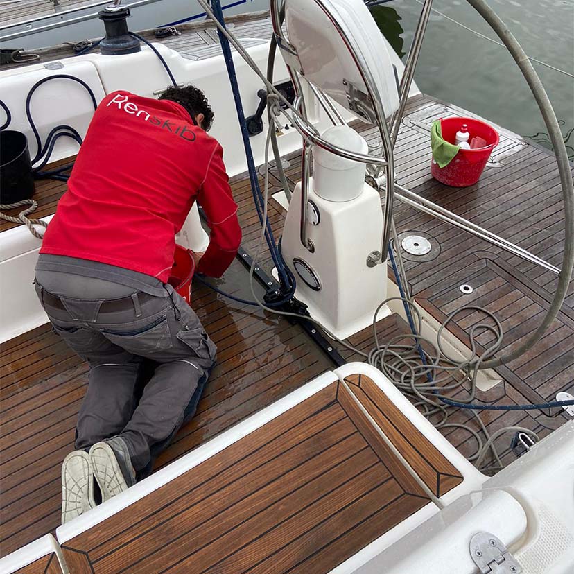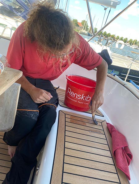 Je teakdek is je trots, maar wat is het een klus om dat mooi schoon te houden. En dan zonder het te beschadigen. We zien soms mensen nog met een hogedrukspuit aan de slag, waarmee je het hout en de rubbers ernstig schade kunt toebrengen. Wij reinigen je teak dek voor je. Wij doen dat met Renskib Teak Cleaner en een zachte scotchbrite. Na een behandeling ziet het er weer als nieuw uit. Je zult dit cleanen zonder behandeling periodiek moeten laten doen, want een teakdek wordt weer groen en grijs.