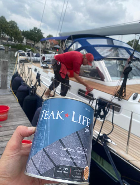 Om dat te voorkomen kunnen wij het teakdek na grondig cleanen met Renskib teak cleaner behandelen met Teak*Life. Dit vermindert de schadelijke effecten van ultraviolet licht, versterkt de waterafstotende werking en verbetert de vormvastheid van je dek. We kunnen dit aanbrengen op nieuwe en oude teakdekken. Bij een ouder dek kan het zinvol om voor het aanbrengen van Teak*Life het dek eerst door ons te laten schuren en eventueel versleten rubbers te laten vervangen.